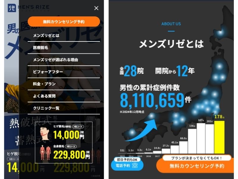 メンズリゼは、男性専門の医療脱毛クリニックで、全国に多数の院を展開しています。医療レーザー脱毛を採用しており、サロン脱毛に比べて短期間で高い脱毛効果が期待できるのが特徴です。