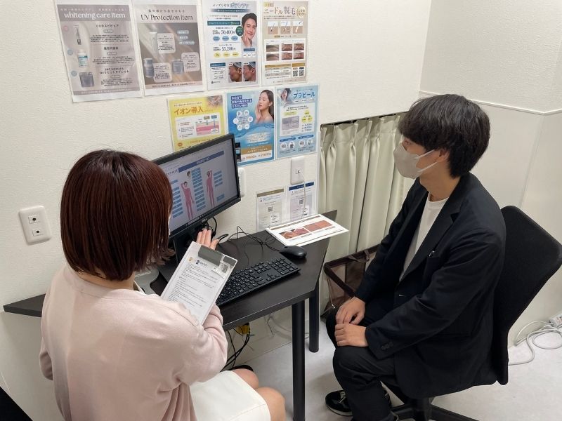名前が呼ばれたらカウンセリング室に移動します。問診票をもとに、肌質や毛質、色素沈着の有無などを確認し、医療脱毛を安全に受けられる状態かどうかをチェックしてもらいました。
