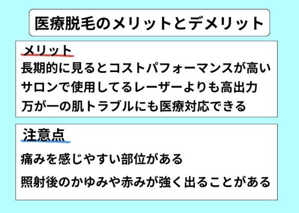 医療脱毛は医療機関で行われるため、万が一照射パワーが強くてやけどをしてしまった場合や、施術後に肌トラブルが発生した場合でも医師による診察や薬の処方などの適切な処置を受けられます。特に薬の処方などの医療行為は医師が常駐している医療脱毛でないと受けられないので、肌トラブルなどが気になる方におすすめです。